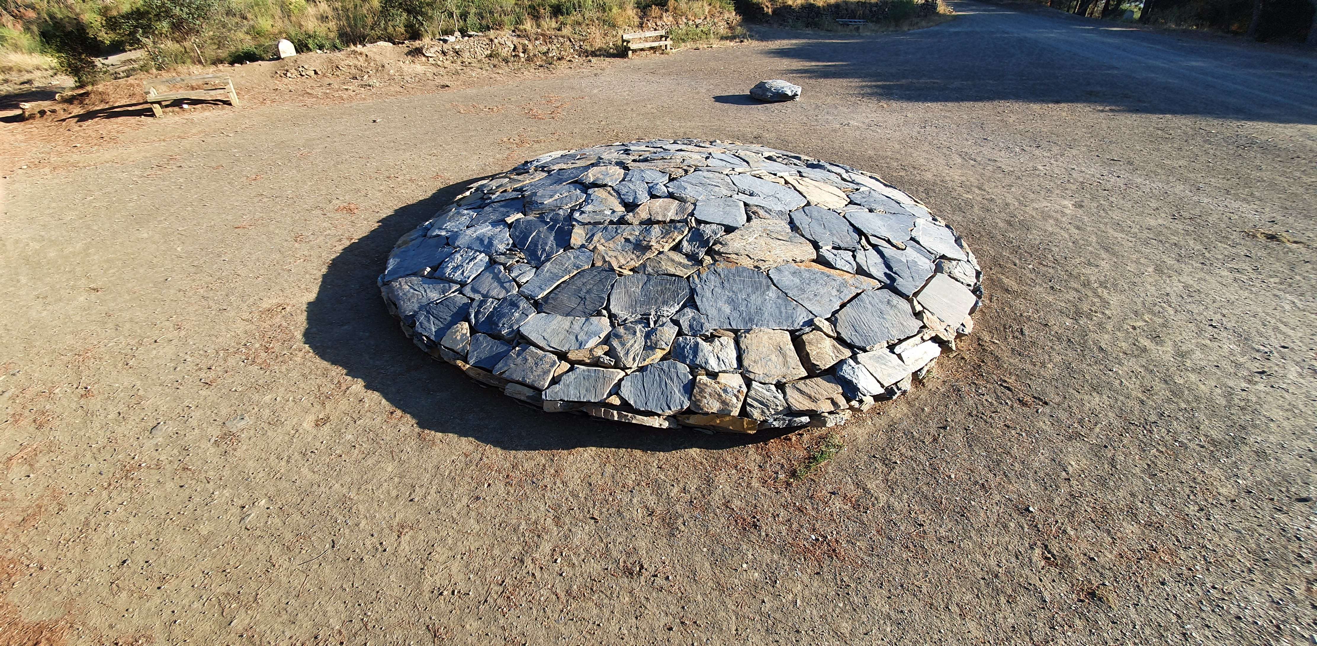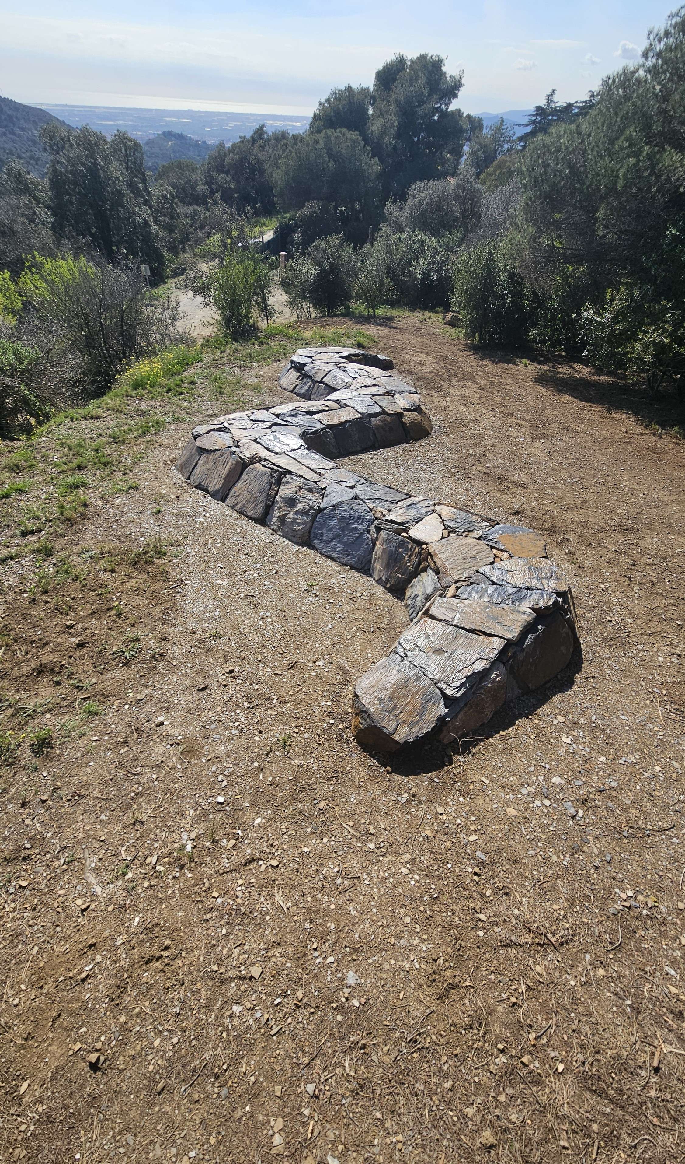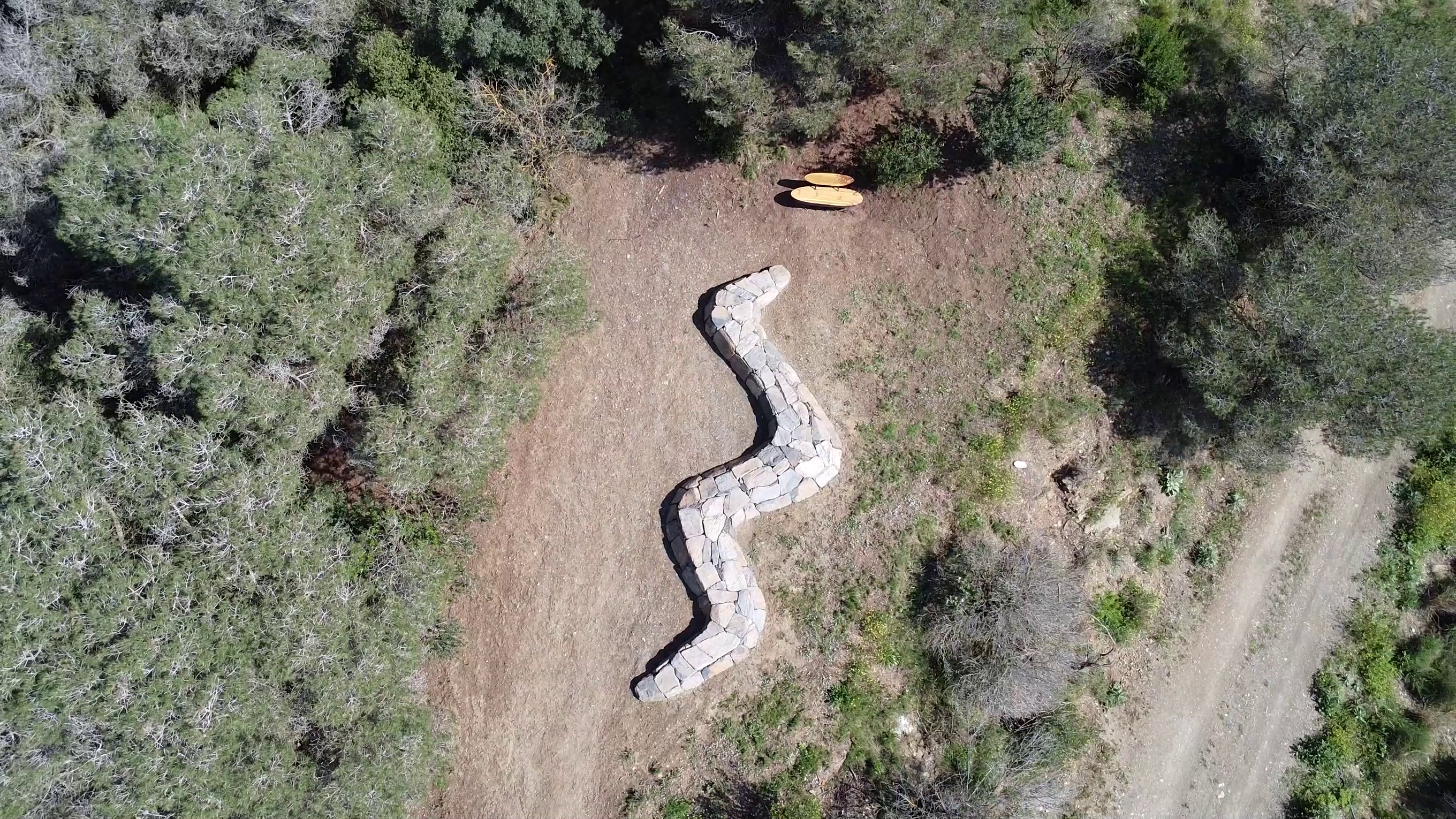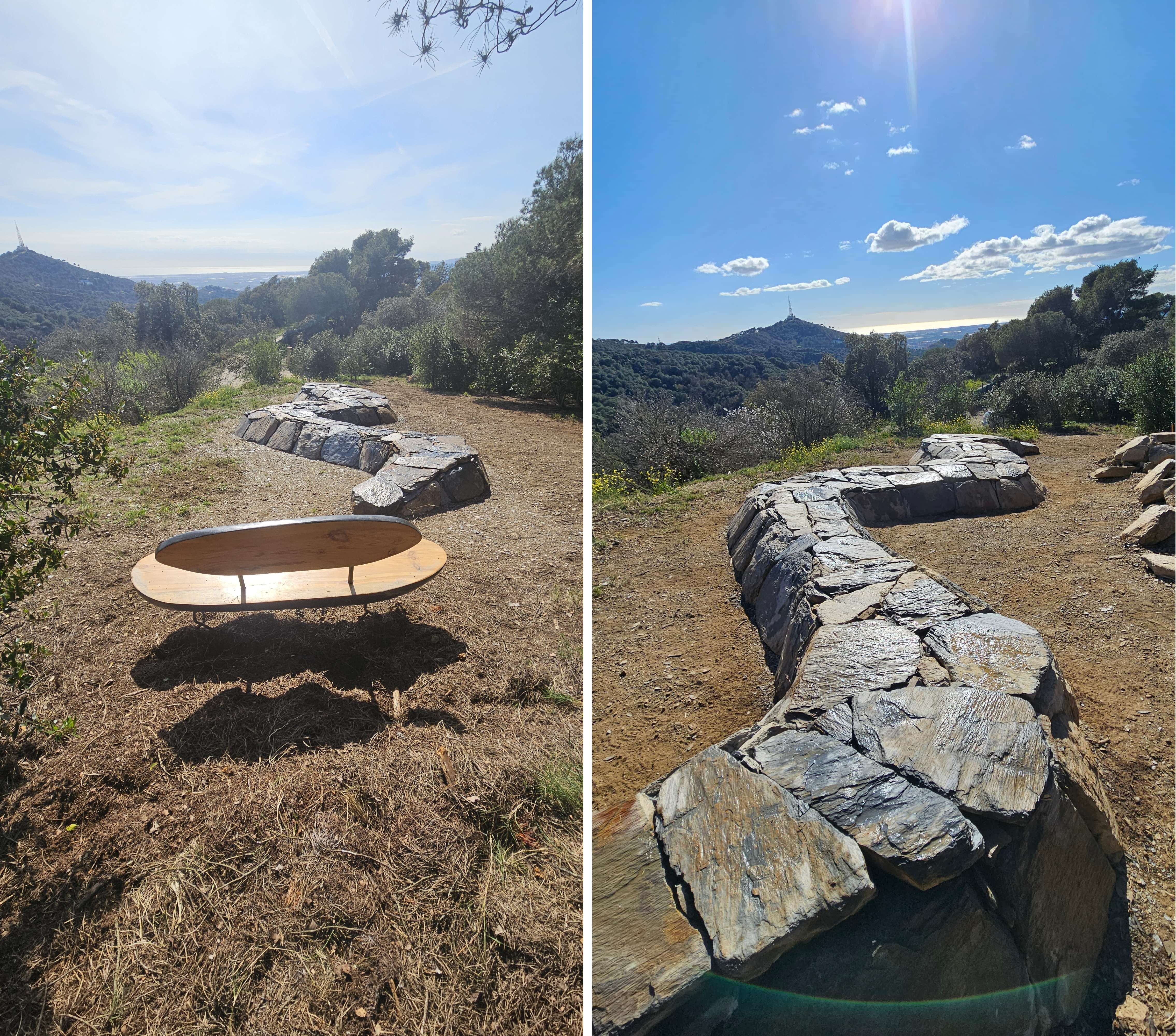 El material utilitzat per a les instal·lacions, la pedra llicorella característica de Collserola, s'integra de manera natural en el paisatge. La tècnica de la pedra en sec, aplicada tant com a recurs constructiu com a element cultural, enllaça profundament amb la història i la identitat del territori, aportant coherència i respecte al conjunt. El projecte inclou un itinerari que convida els visitants a descobrir els valors naturals, culturals i paisatgístics de la zona, transformant Collserola en un circuit d'art a l'aire lliure.
