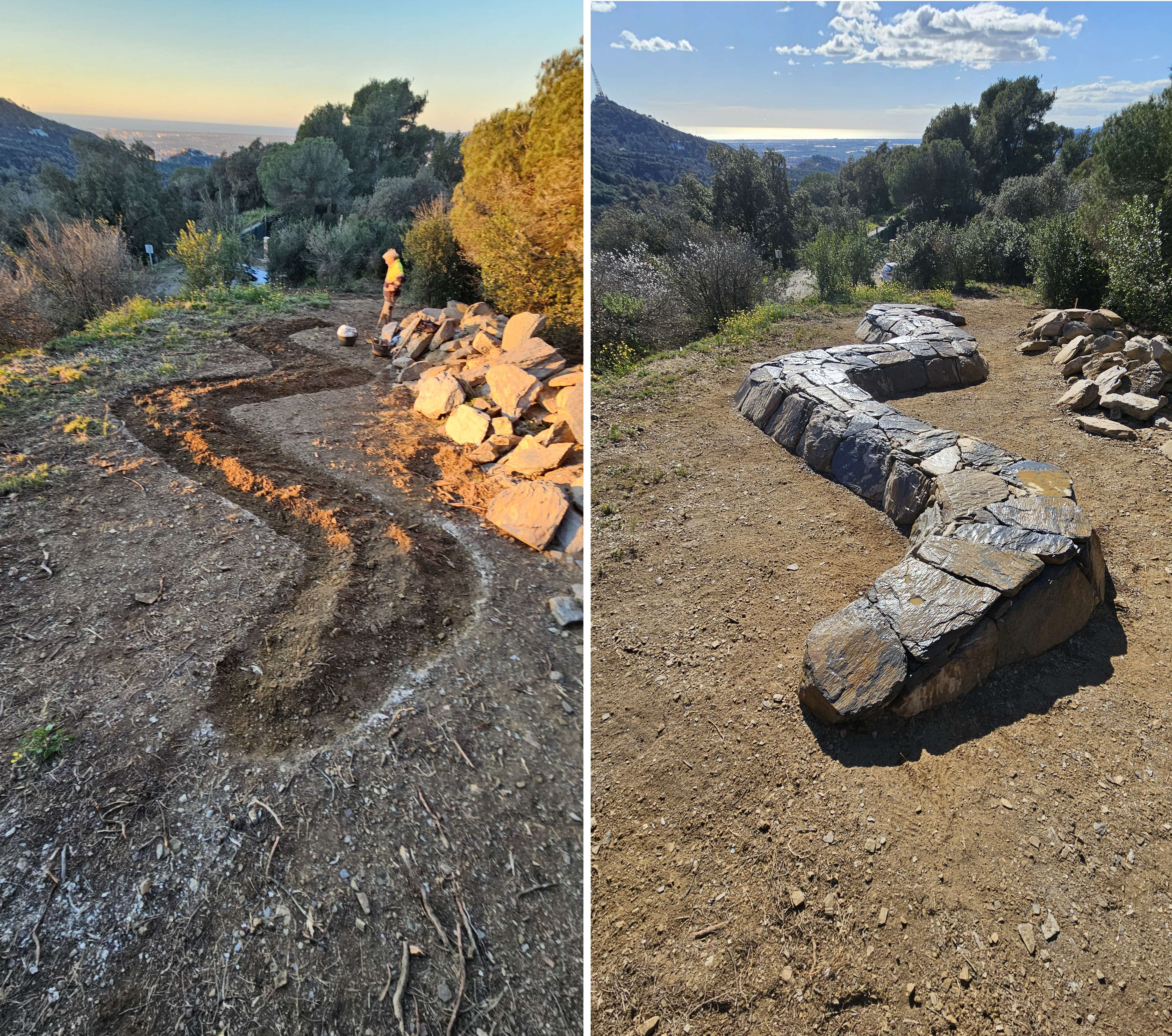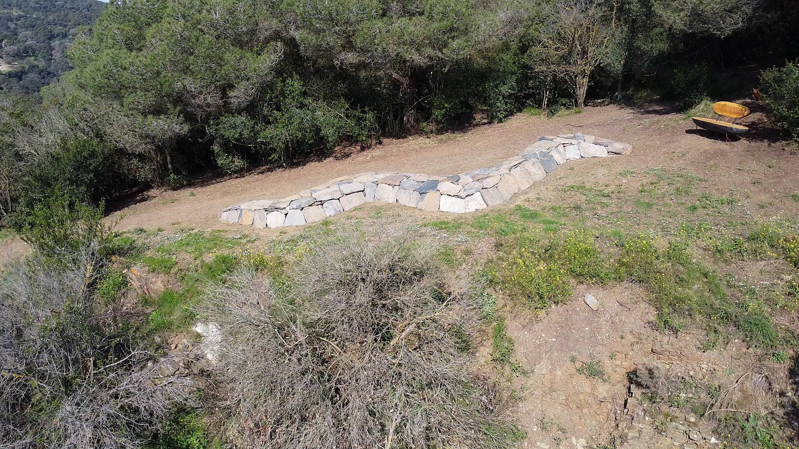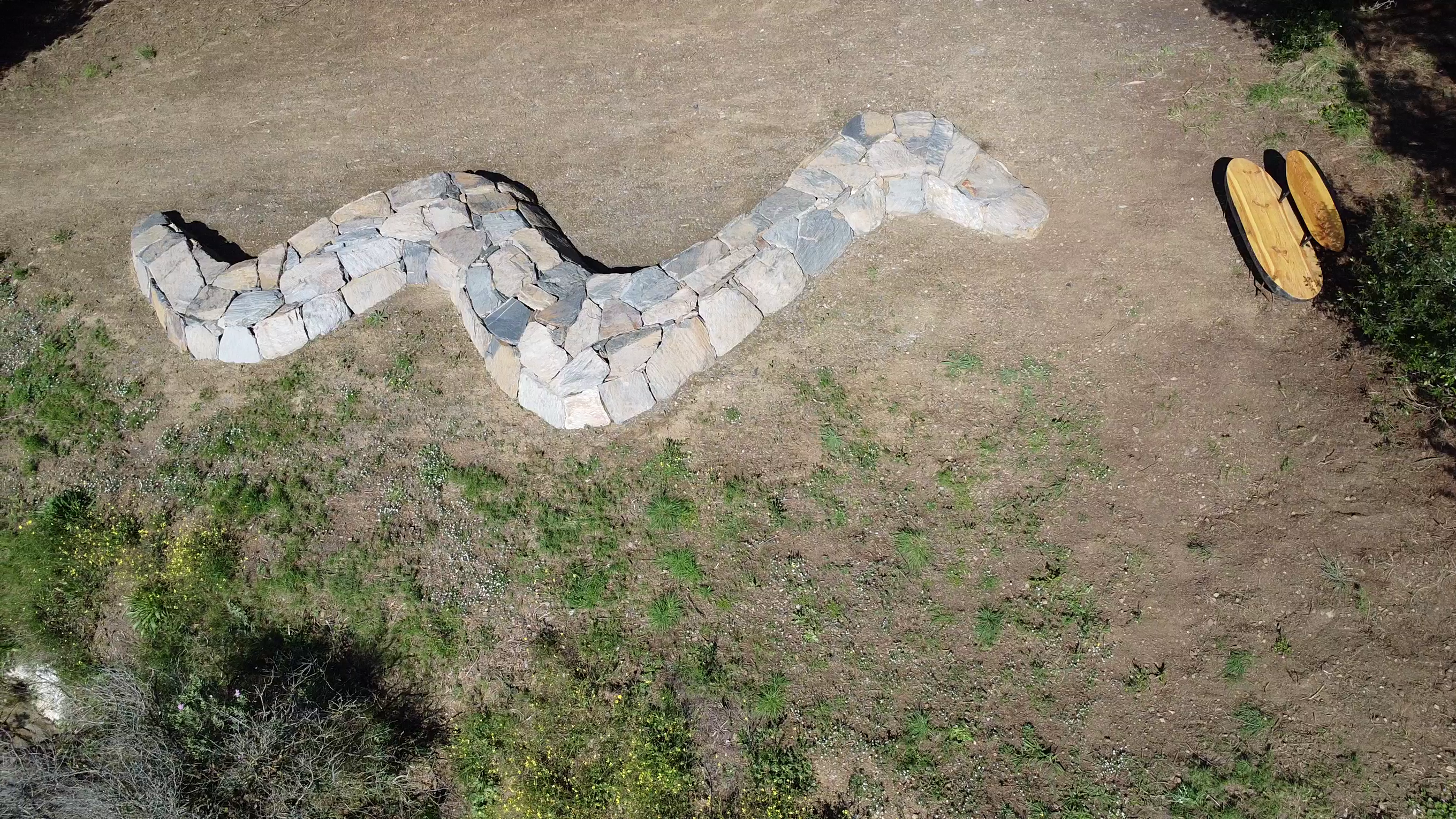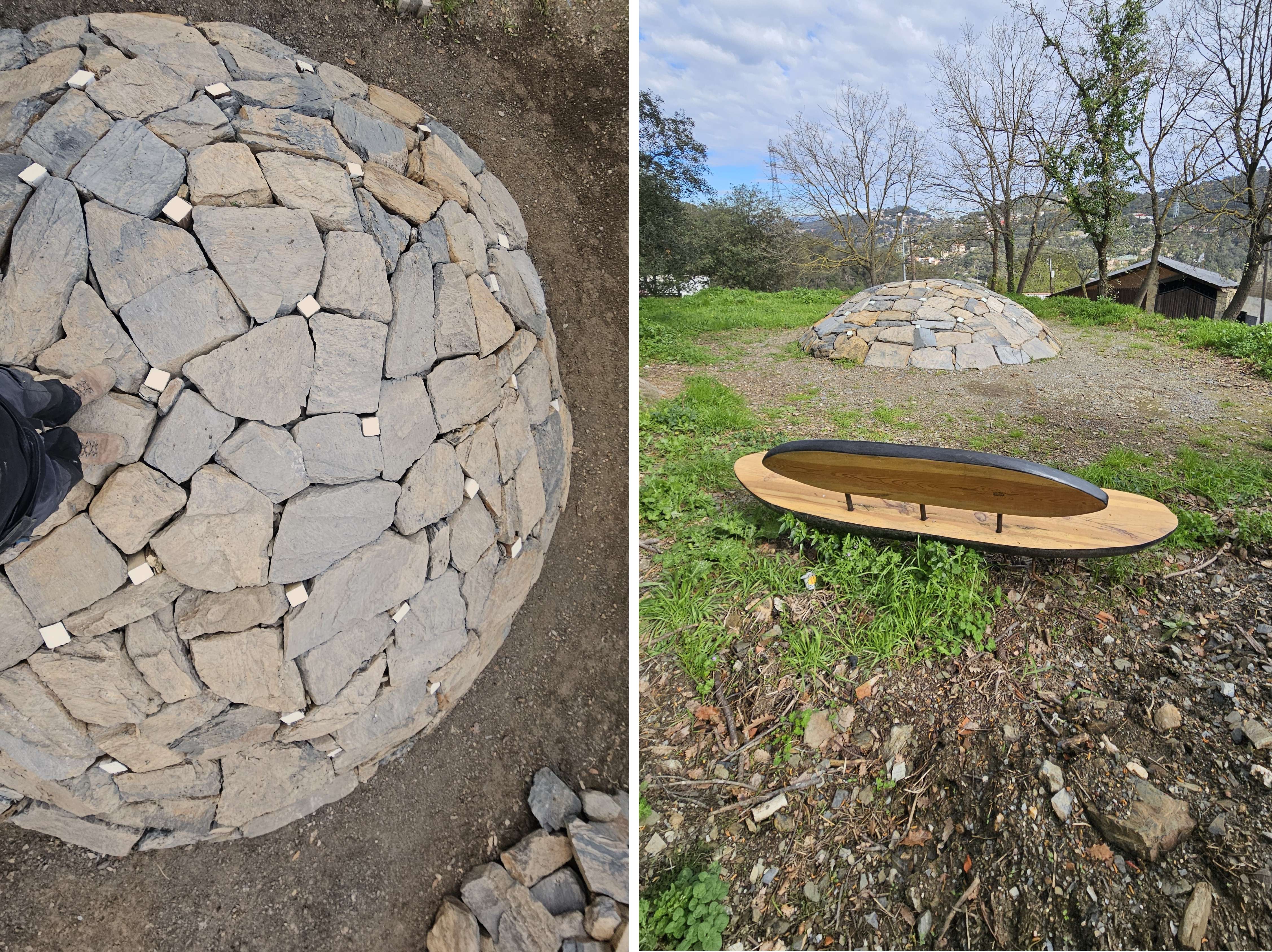 El material utilitzat per a les instal·lacions, la pedra llicorella característica de Collserola, s'integra de manera natural en el paisatge. La tècnica de la pedra en sec, aplicada tant com a recurs constructiu com a element cultural, enllaça profundament amb la història i la identitat del territori, aportant coherència i respecte al conjunt. El projecte inclou un itinerari que convida els visitants a descobrir els valors naturals, culturals i paisatgístics de la zona, transformant Collserola en un circuit d'art a l'aire lliure.