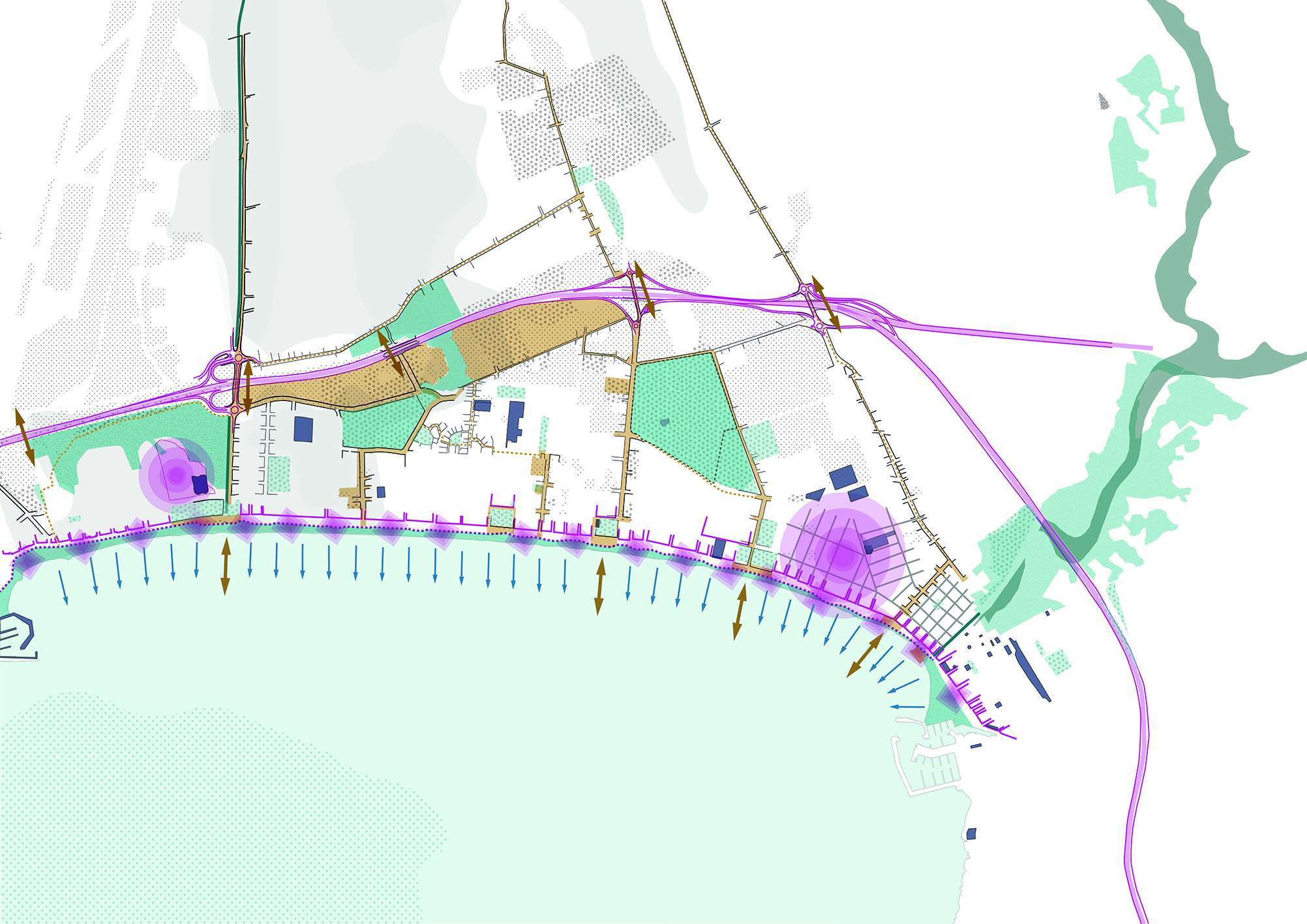 Sobre un ámbito de 36 ha y un presupuesto estimado de 118.000.000,00€, el proyecto plantea una intervención estratégica de carácter multiescalar que redefine el frente marítimo como un parque lineal costero y estructura transversalmente el territorio mediante corredores verdes y ejes cívicos que conectan mar y interior. La propuesta integra soluciones basadas en la naturaleza (SbN), sistemas urbanos de drenaje sostenible (SUDS), infraestructura verde, azul y gris, y una plataforma peatonal unificada con prioridad para el peatón y la bicicleta.